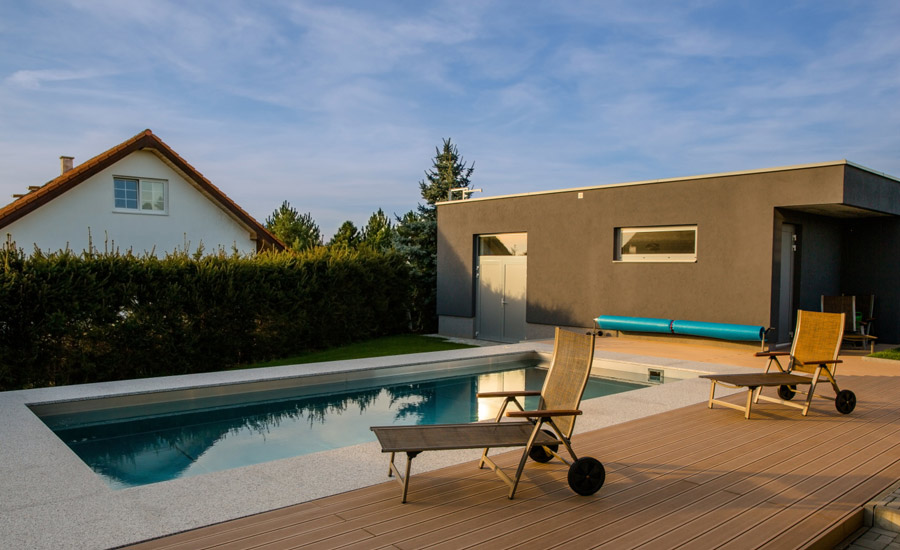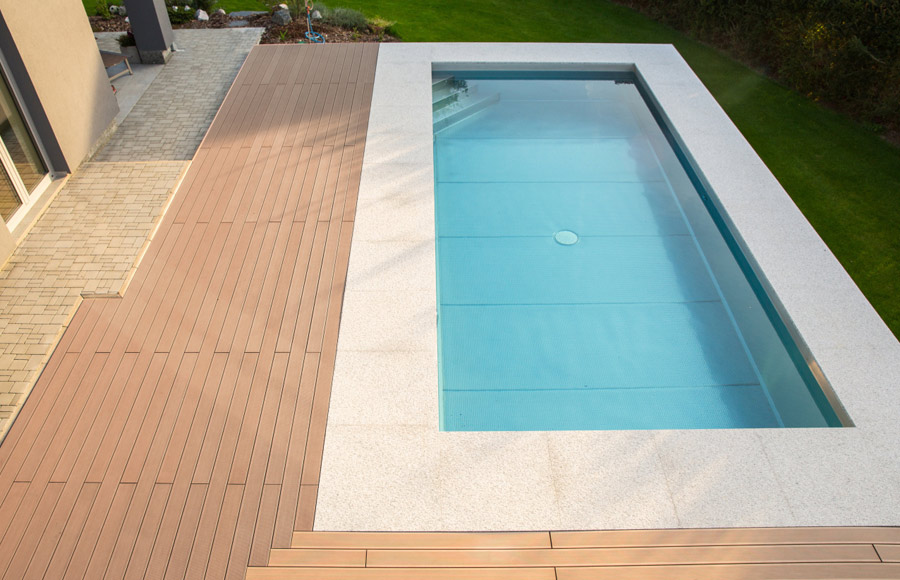 Terasa Star představuje čisté linie a moderní, drážkovaný vzhled. Díky drážkám zabraňujícím uklouznutí a odolnosti materiálu proti chlorové vodě je terasa velmi vhodná k bazénu. Vyberte si z celkem 4 barevných provedení.