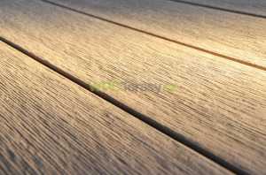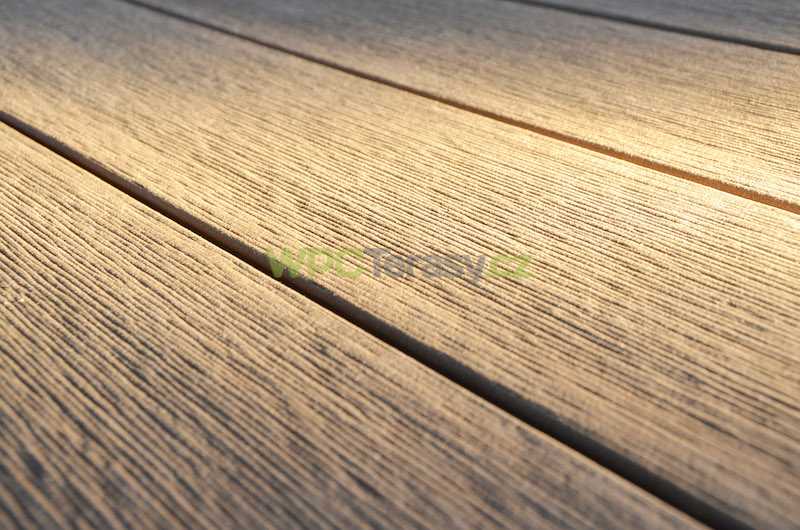 Povrch terasových prken Top Rustic vyniká přírodní dřevěnou kresbou, díky čemuž přinášejí na vaši terasu autentický vzhled dřeva. Toho je dosaženo vlisováním dřevěných let do kartáčovaného povrchu. Vzhledově se tak terasa odlišuje od běžných drážkovaných nebo hladkých WPC prken.